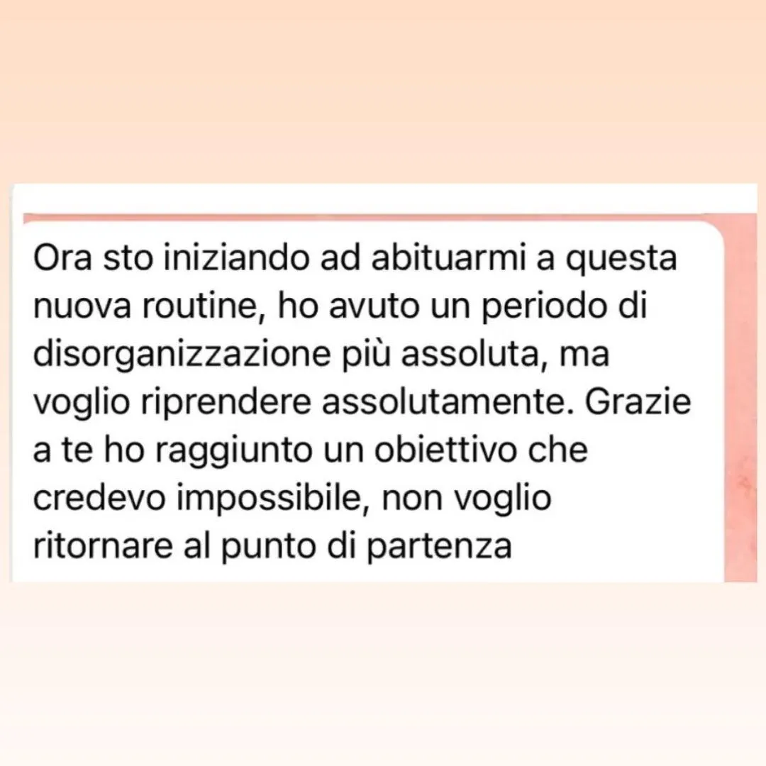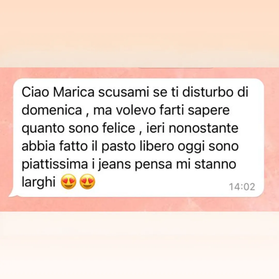 Ricevere supporto continuo e personalizzato: sarò al tuo fianco in ogni fase del tuo percorso, disponibile via WhatsApp per rispondere alle tue domande e motivarti nei momenti più difficili.